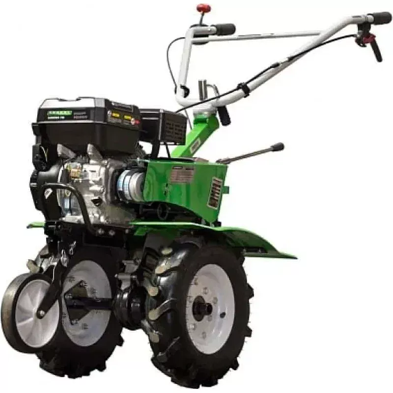 Четырехтактный двигатель заводится при помощи ручного стартера. Элементы управления удобно расположены под руками. Опуская ручки вниз, вы уменьшаете глубину вспашки и увеличиваете скорость движения бензинового мотоблока. Поднимая ручки выше, вы снижаете скорость машины. В экстренном случае двигатель легко заглушить, нажав кнопку переключателя.
