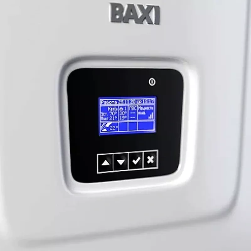 Рабочие параметры котла можно устанавливать удаленно в специализированном программном приложении. В аппарате предварительно запрограммированы режимы: «не используется», «рабочий день», «выходной день», «автоматический», «праздник», «отпуск». Литиевая батарейка поддерживает работу часов и календаря в реальном времени. При аварийном отключении электрического котла BAXI от электросети все настройки сохраняются в памяти прибора.