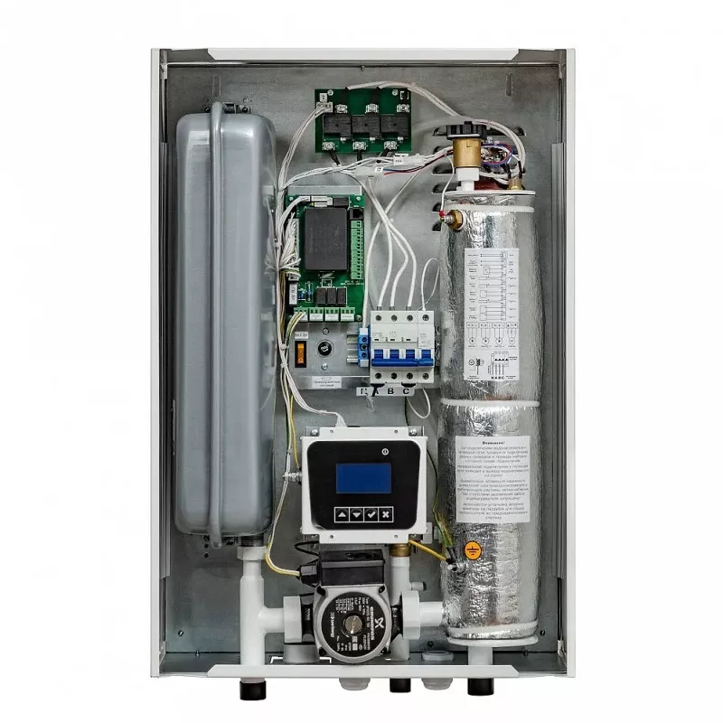 На дисплее с подсветкой отображаются рабочие параметры, такие как ступень мощности, температура теплоносителя, код ошибки и прочие. В зависимости от погодных условий котел автоматически поддерживает заданный уровень нагрева. Значение потребляемой мощности можно ступенчато переключать на 9, 15 и 24 кВт. Котел функционирует по графику, указанному в настройках.