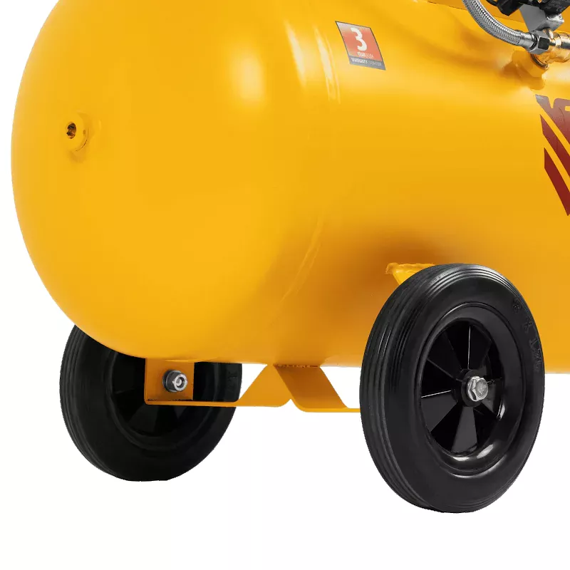 - Мобильность — компрессор оборудован ручкой и 3 колесами (из них 1 поворотное) для удобного разворота и перемещения.