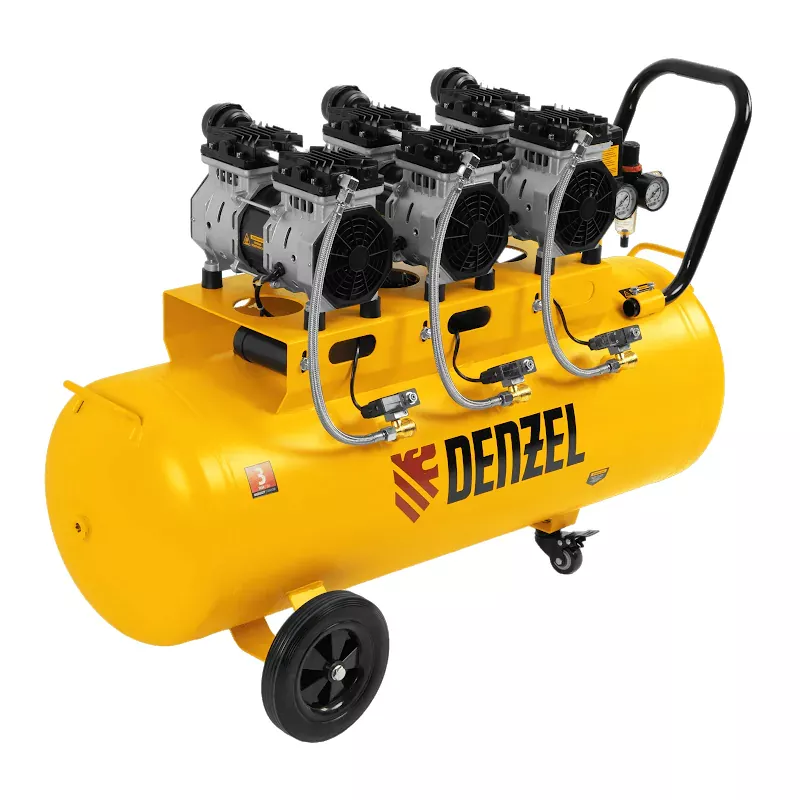 Безмасляный малошумный компрессор Denzel DLS 1800/100 58028 мощностью 1800 (3 х 600) Вт, объемом ресивера 100 л и производительностью 345 л/мин предназначен для обеспечения пневмоинструмента сжатым воздухом, подаваемым под давлением до 8 бар. Позволяет подключить пневматический заклепочник, дрель, шлифмашину и т. д. Оптимален для работы с краскопультом и для продувки электронных компонентов, т. к. в сжатом воздухе отсутствуют частицы масла. Компрессор пригодится в мастерской, гараже, на строительной площадке.