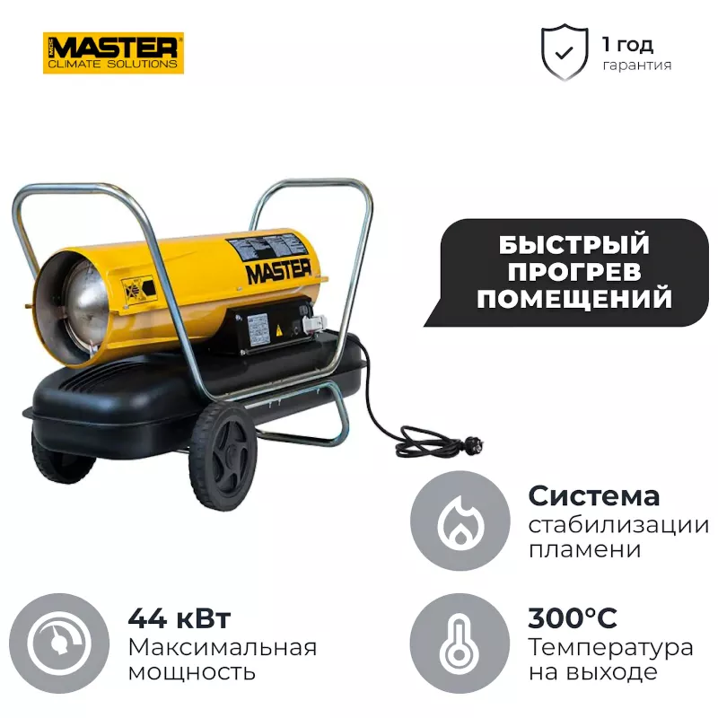 Дизельная тепловая пушка Master выполнена из прочных материалов, поэтому рассчитана на длительный срок службы даже при интенсивном использовании. Модель покрыта краской, которая выдерживает резкие перепады температуры. Камера сгорания изготовлена из нержавеющей стали и отделена от внешнего корпуса. Это предотвращает перегрев модели, а также исключает риск получения ожога при случайном касании корпуса.