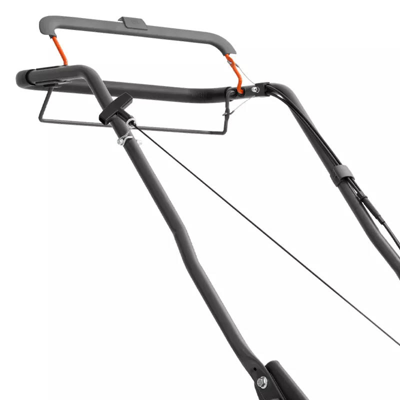 Рукоятка газонокосилки компактно складывается. Это позволит хранить модель в небольшом помещении или перевозить в багажнике легкового автомобиля. А перед работой держатель легко настроить по высоте.