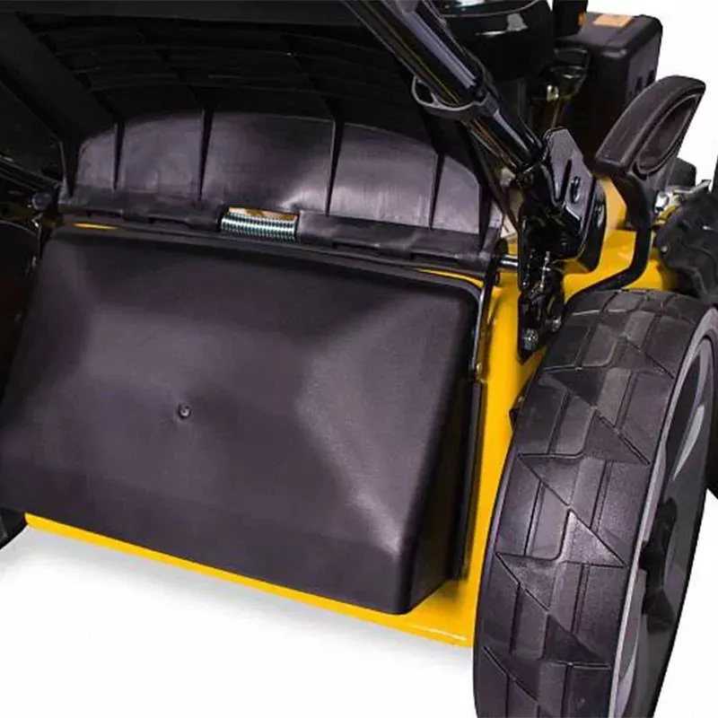 Высота покоса устанавливается с помощью 8-позиционной рукоятки по центру корпуса. Минимальное значение составляет 20 мм, максимальное – 80 мм. Все скошенные отходы поступают в травосборник, который вмещает до 70 л мусора, что позволяет обрабатывать территорию на протяжении долгого времени.