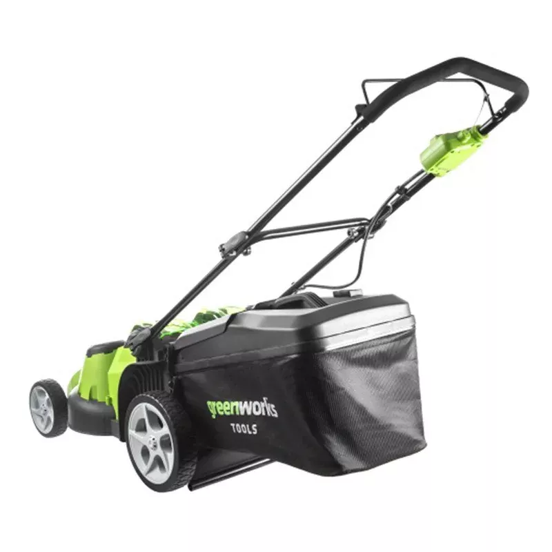 Как и на остальных моделях газонокосилок Greenworks установлена схема защиты двигателя от механических повреждений, защиты от случайного включения, обязательный ключ безопасности и кнопка-предохранитель. Для удобства хранения ручка газонокосилки складывается и её можно компактно хранить до следующего использования.