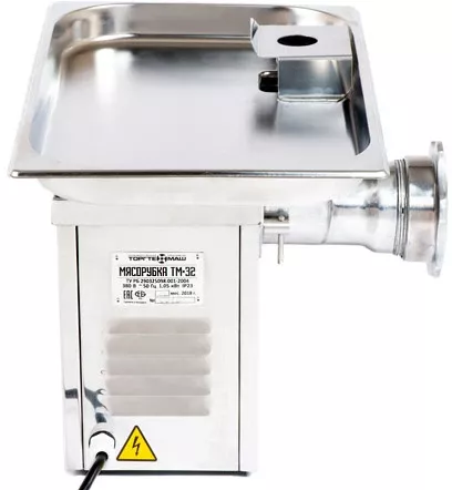 • На мясорубке Торгтехмаш установлен бесшумный червячный редуктор. Он создает значительные усилия на ножах, что дает возможность перемалывать очень жёсткие продукты, включая хрящи и мелкие кости, а также позволяют агрегату работать более плавно.