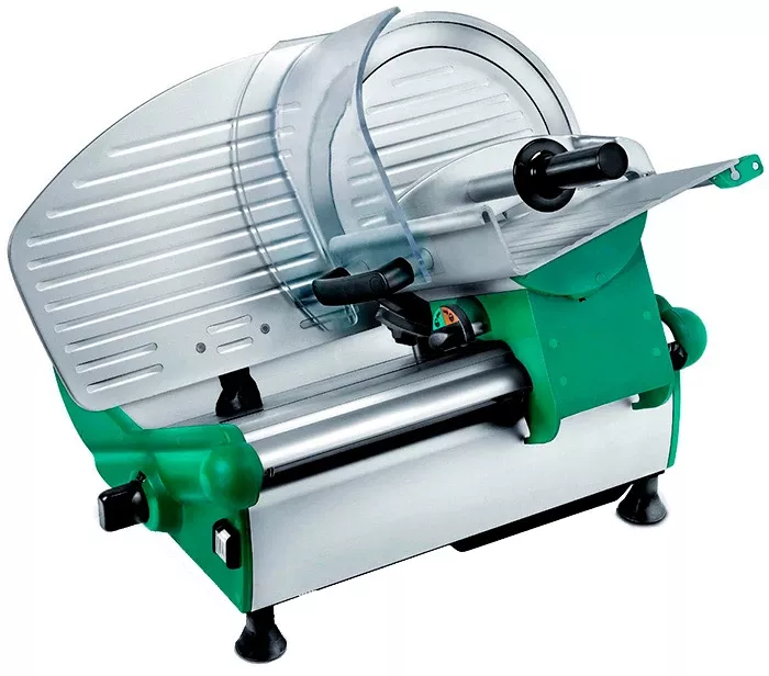 Слайсер работает в полуавтоматическом режиме. Наклонная каретка возвратно - поступательным движением толкается по направлению к вращающемуся дисковому ножу. Продукт, закрепленный на продуктовом столе каретки держателем, под действием сил гравитации давит на нож, что способствует очень быстрой, эстетичной и экономной нарезке.