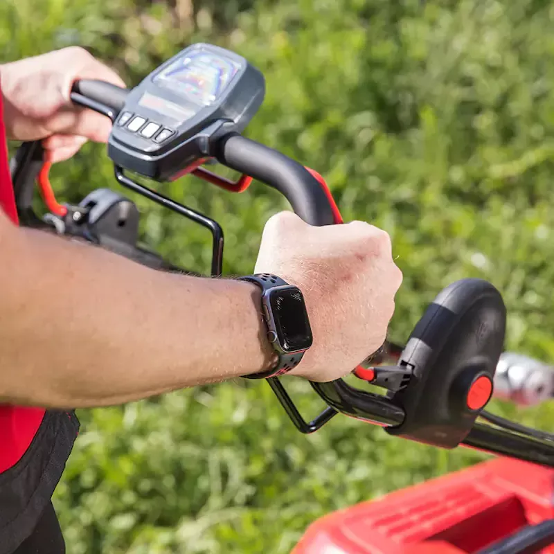 Для удобства управления и визуального контроля основных рабочих параметров газонокосилки Solo by AL-KO 5272 Li VS-W предусмотрены выносной блок на рукоятке, а также возможность установки соединения с приложением AL-KO inTouch. Функция Smart Cockpit отображает информацию о состоянии подключения, заряде аккумулятора и ошибках. Функция Eco-Mode позволяет менять скорость и включать режим энергосбережения. Зеленый цвет смарт-кнопки означает, что аккумулятор заряжен, красный — сообщает о необходимости подзарядки.